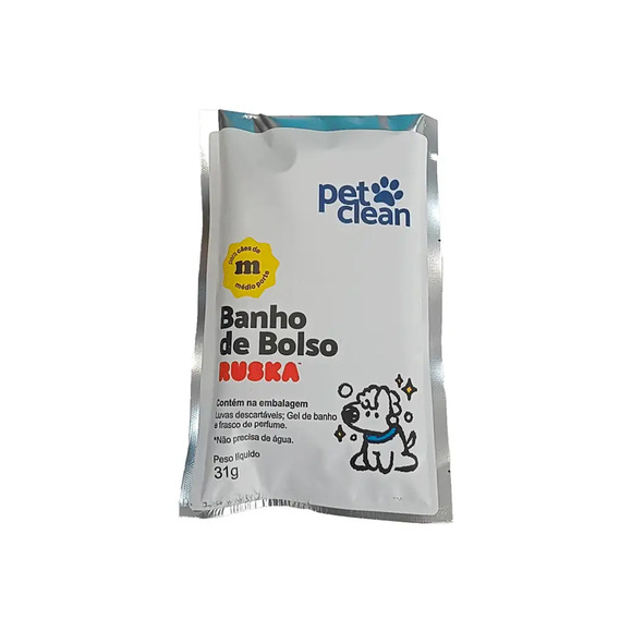 Banho a Seco de Bolso Ruska Pet CleanBrincar é uma atividade muito importante para os pets pois faz com que se movimentem e gastem energia auxiliando para uma vida mais saudável. Mas às vezes seu pet se empolga com a brincadeira corre deita e rola na grama na terra ou na lama não é mesmo? Para uma limpeza rápida e prática chegou o Banho a Seco de Bolso Ruska Pet Clean.Embalagem individual compacta que cabe no bolso ou na bolsa de dose única para fazer uma higiene emergencial. O Banho a Seco de Bolso Ruska é um kit composto de um par de luvas descartáveis um gel de banho e um frasquinho de perfume para deixar seu animalzinho limpo e perfumado em questão de minutos.É um item que não pode faltar no seu dia a dia e na hora dos passeios com seu amigo. Aqui na você encontra o Banho a Seco de Bolso Ruska Pet Clean com ótimo preço no site App ou nas lojas físicas.ComposiçãoGel de banho: Água cocoamidopropilbetaína carbopol lanolina glicerina bicarbonato de sódio óleo de cambre óleo de abacate óleo de girassol ácido linoleico pantenol extrato de aloe vera bronopol metilcloroisotiazo-linona e metilisotiazolinona.Perfume: Álcool água fragrância bronopol metilcloroisotiazolinona e metilisotiazolinona.Luvas descartáveis: Plástico.Modo de usarAbra a embalagem e retire os itens do kit.Coloque as luvas descartáveis.Abra o gel de banho e despeje gradativamente nas luvas espalhando bem.Espalhe o gel com as mãos por toda a pelagem massageando bem.Após a higienização para finalizar aplicar o perfume.