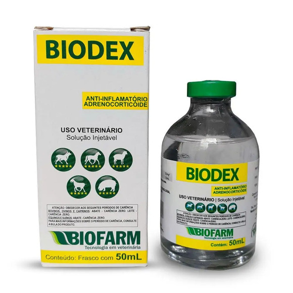Biodex Injetável Biofarm .Indicações:Biodex Injetável Biofarm .éindicado no tratamento de poliartrites reumatismo artrites e dores articulares muscularese nervosas. Também indicado nas afecções alérgicas pruridos associados com dermatoses eczemas não específicos e estados anafiláticos. E devido aos seus efeitos glicogênicos indicado na cetose bovina. .Fórmula:Cada 1ml de .Biodex Injetável Biofarm .contém:Dexametasona .(fosfato dissódico) ...................................... 50mgVeículo q.s.p. .........................................................................10ml* Equivalente a 38mg de dexametasona base. .Dosagem e administração:Equinos e bovinos (adultos) .......................... 2 a 5mlAnimais de porte médio ................................ 1 a 3mlAdministrar .Biodex Injetável Biofarm .por via intramuscular ou intravenosa. .Apresentação:Biodex Injetável Biofarm .em frascos de .10 e 50ml.SOBREA dexametasona como sendo um derivado sintético do cortisol possui a capacidade de impedir o desenvolvimento de calor rubor entumescimento e a sensibilidade local pelas quais a inflamação éconhecida. A nível microscópico inibemnão somente os fenômenos iniciais do processo inflamatório (edema deposição de fibrina dilatação capilar migração de leucócitos para a área inflamada e atividade fagocítica) mas também as manifestações tardias (proliferação capilar proliferação de fibroplastos deposição de colágenos e posteriormente cicatrização). .Biodex Injetável Biofarm .éindicado no tratamento de poliartrites reumatismo artrites e dores articulares musculares e nervosas. Também indicado nas afecções alérgicas pruridos associados com dermatoses eczemas não específicos e estados anafiláticos. Compre já o seu .Biodex Injetável Biofarm!!CARêNCIACarência: zeroINDICAçõESBiodex Injetável Biofarm éindicado no tratamento de poliartrites reumatismo artrites e dores articulares musculares e nervosas. Também indicado nas afecções alérgicas pruridos associados com dermatoses eczemas não específicos e estados anafiláticos. E devido aos seus efeitos glicogênicos indicado na cetose bovina.