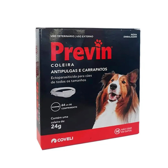 Coleira Antipulgas e Carrapatos Previn 64cmA Coleira Antipulgas e Carrapatos Previn 64cm é indicada para o tratamento prevenção e controle de infestações de ectoparasitas em cães (Piolhos pulgas e carrapatos).A Coleira Antipulgas Previn pode ser colocada em cães a partir de 5 semanas de vida tendo ação de até 4 meses contra pulgas e carrapatos.Por conta da sua ação eficaz não é necessário tirar a coleira do pet para tomar banho ou se preocupar caso o cãozinho pegue alguma chuva.Modo de usoBasta tirar a coleira da embalagem e fixar a coleira ao redor do pescoço do animal sem apertar. Caso tenha alguma sobra basta cortar e descartar. Ao fim dos 4 meses se notar a perda da eficiência da coleira descartar devidamente e substituir por uma nova.ComposiçãoDiazinonNa você encontra a Coleira Antipulgas e Carrapatos Previn e muito mais com os preços imperdíveis. Aproveite!