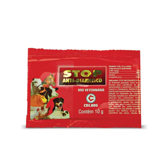 Stop Anti-DiarréicoIndicações:Stop Anti-Diarréico éum pó finamente granulado inclui na sua fórmula duas substâncias de ação bacteriostática e bactericida: o Sulfametoxazol e o Trimetoprim. Antidiarréico de potente ação bacteriostática e bactericida indicado no tratamento das seguintes infecções causadas por: Salmonella spp (diarréia dos ruminantes recém-nascidos dos leitões e bezerros enterites e gastrenterites agudas dos equinos leitões cães gatos e aves) Escherichia coli (diarréia dos recém-nascidos) Campylobacter spp (diarréia e enterites agudas dos leitões) Eimeria spp (coccidiose dos ovinos diarréia dos bezerros e enterites das aves) Clostridium perfringens (diarréia dos recém-nascidos enterites agudas e enterites toxinfecciosas dos bovinos ovinos suínos e aves) Cystoisospora spp (enterites dos cães e gatos).Dosagem:Via oral.Cães gatos e equinos: 1 envelope de Stop Anti-Diarréico para cada 34kg.Suínos: 1 envelope de Stop Anti-Diarréico para cada 20kg.Bovinos: 1 envelope de Stop Anti-Diarréico para cada 40kg.Administrar em intervalos de 24 horas e manter o tratamento por até48 horas após cessarem os sintomas clínicos ou a critério do Médico Veterinário.Observações: o tratamento não deve exceder a 7 dias. Pode ser misturado à. ração ou dissolvido na água de bebida ou leite tomando-se o cuidado do animal ingerir a quantidade total da posologia em cada tomada.Toxicidade:Uma dose maciça de sulfonamida por via oral (mais de 10 vezes a dose terapêutica) em cães estimula o sistema nervoso central com sintomas como corridas sem finalidade paralisia espástica convulsões coma e efeitos intermediários como hiperestesia vômitos e vertigem. Em outras espécies causa (em dosagens a partir de 10 vezes a dose terapêutica) anorexia e diarreia mas não está claro que seja o efeito da perturbação gastrintestinal ou de estimulação do sistema nervoso central. Os efeitos colaterais devido ao componente Trimetoprim são bastante raros. Doses até10 vezes a recomendada podem ser administradas sem riscos.Limitações de uso do Stop Anti-Diarréico:Em animais sensíveis aos componentes da formulação nas discrasias sanguíneas e insuficiência renal.Período de carência do Stop Anti-Diarréico:Recomenda-se aguardar 16 dias após o término da administração do produto para enviar os animais ao abate e sete dias para o aproveitamento do leite para consumo humano.Apresentação do produto Stop Anti-Diarréico:Envelopes contendo 10g e pote com 500g.FORMULACada 10g do Stop Anti-Diarréico contém:Sulfametoxazol (equivalente a 985 mg/g)&hellip...................&hellip.&hellip..100gTrimetoprim&hellip.&hellip.&hellip.&hellip....&hellip.&hellip.&hellip.&hellip.&hellip.&hellip.&hellip.&hellip.&hellip.&hellip..............&hellip.008gPectina&hellip.&hellip.&hellip.&hellip.&hellip.&hellip.&hellip.&hellip.&hellip.&hellip.&hellip.&hellip.&hellip.&hellip................&hellip.&hellip.&hellip...180gExcipiente q.s.p. &hellip.&hellip.&hellip.&hellip.&hellip.&hellip.&hellip.&hellip.&hellip.&hellip.&hellip..&hellip....................1000gSOBREPrecisa de uma solução para acabar com a diarréia no seu animal? Não se preocupe você está no lugar certo! Stop Antidiarréico éeficaz no tratamento das infecções por Samonella spp. Escherichia coli Campylobacter spp. Eimeria spp. Clostridium perfringens e Cystoisospora spp (diarréia dos ruminantes leitões cães gatos e aves). Se você procura resultado rápido e seguro você procura por Stop Antidiarréico! Compre compare e comprove!CARêNCIAAbate: 16 dias | Leite: 7 dias