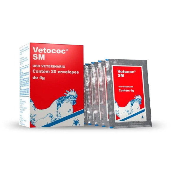 VETOCOC SM 20 X 04GRVetococ Sm é indicado para uso em aves age com alto nível de eficacia no controle da coccidiose ou eimeriose e da cólera aviaria. Além dissoauxilia no tratamento da coriza infecciosa das aves e da diarreia branca dos pintos.Dosagem Vetococ:Curativo - 1 envelope de 4g diluido em 2 Litros de agua diariamente durante 3 dias descansar 2 dias e repetir se necessario.Preventivo - 1 envelope de 4g diluido em 4 Litros de agua diariamente durante 3 dias descansar 2 dias e repetir se necessario.Fórmula: Cada 100g contémSulfametazina - 125gSulfaquinoxalina - 500gBacitracina de Zinco - 25g